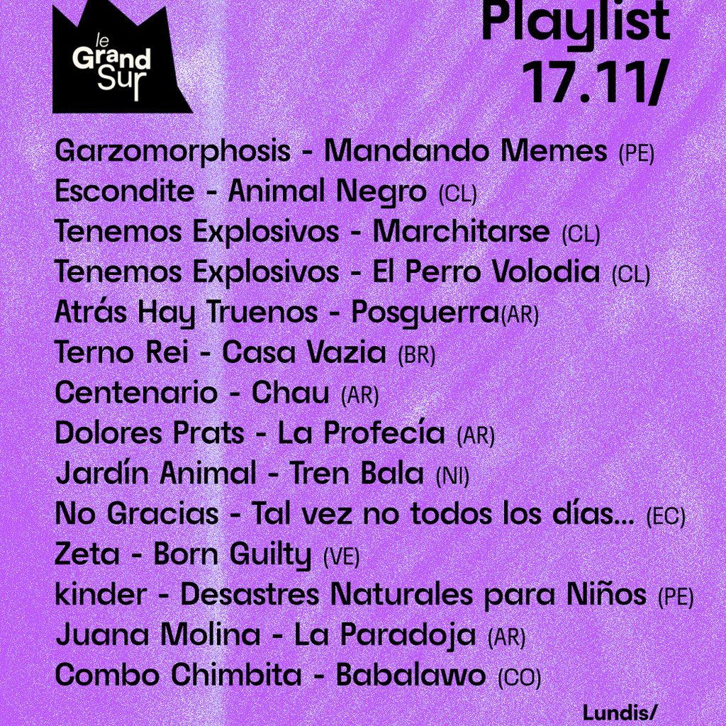 Le Grand Sur explore l'état actuel du rock indépendant sud-américain. Dans cet épisode, nous entendrons: garzomorphosis, Escondite, Tenemos Explosivos, Atrás Hay Truenos, Terno Rei, Centenario, kinder, Zeta, No Gracias, Juana Molina, Jardín Animal, Dolores Prats, Combo Chimbita
