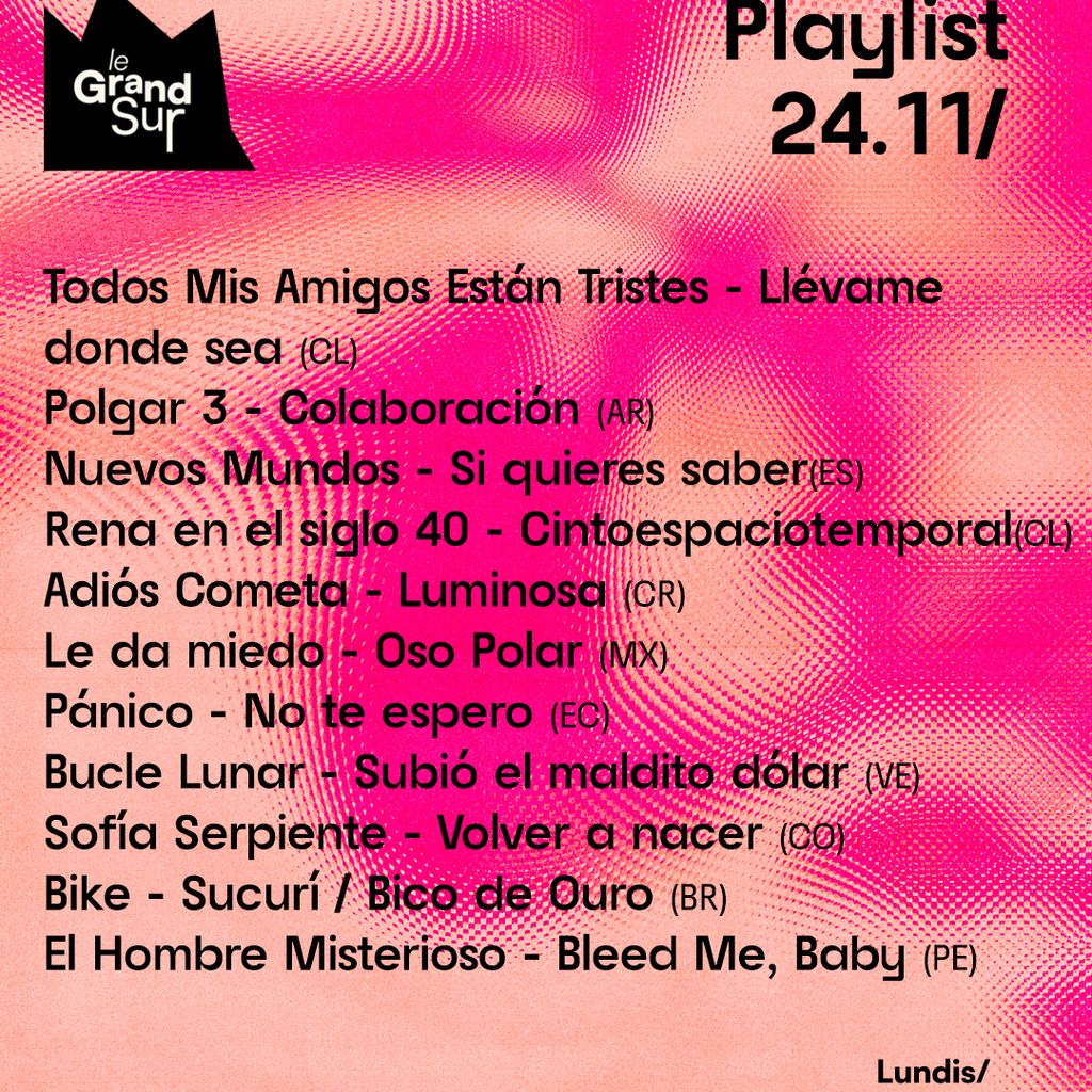 Le Grand Sur explore l'état actuel du rock indépendant sud-américain. Dans cet épisode, nous entendrons: Todos mis amigos están tristes, Polgar 3, Nuevos Mundos, Rena en el siglo 40, Adiós Cometa, Le da miedo, Pánico, Bucle Lunar, Sofía Serpiente, Bike, El Hombre Misterioso