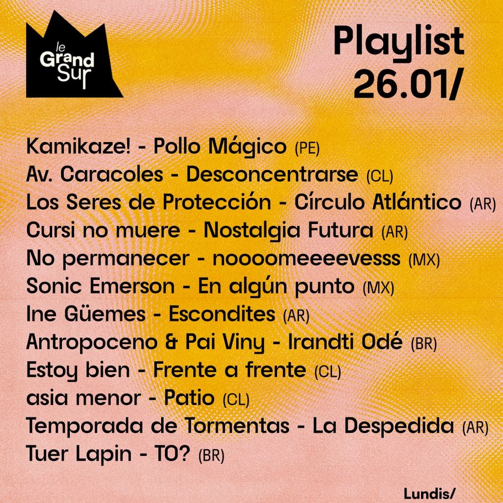 Le Grand Sur explore l'état actuel du rock indépendant sud-américain. Dans cet épisode, nous entendrons: Kamikaze!, Cursi no muere, Los seres de protección, Av. Caracoles, Tuer Lapin, Atropoceno, Sonic Emerson, No permanecer, Sonic Emerson, Ine Güemes, Temporada de Tormentas, Estoy bien, Asia menor.