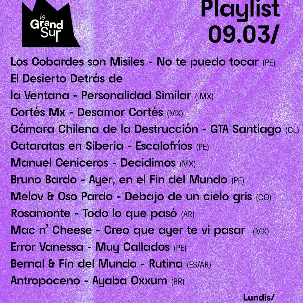 Le Grand Sur explore l'état actuel du rock indépendant sud-américain. Dans cet épisode, nous entendrons: Los Cobardes Son Misiles, El Desierto Detrás de la Ventana, Cortés Mx, Cámara Chilena de la Destrucción, Cataratas en Siberia, Manuel Ceniceros, Bruno Bardo, Melov, Oso Pardo, Rosamonte, Mac N' Cheese, Error Vanesa, Bernal, Fin del Mundo, Antropoceno.