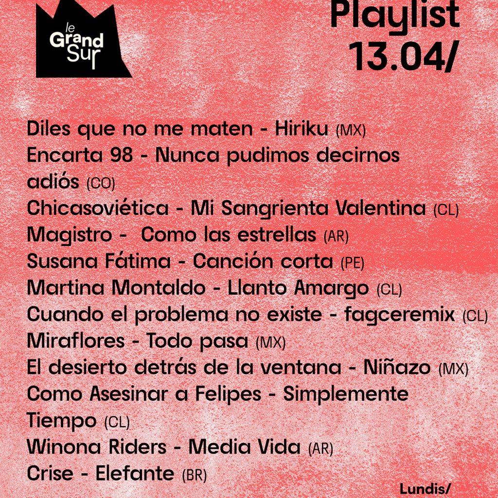 Le Grand Sur explore l'état actuel du rock indépendant sud-américain. Dans cet épisode, nous entendrons: Diles que no me maten, Encarta 98, Chicasoviética, Magistro, Susana Fátima, Martina Montaldo, Cuando el problema no existe, Miraflores, El desierto detrás de la ventana, Como Asesinar a Felipes, Winona Riders, Crise.