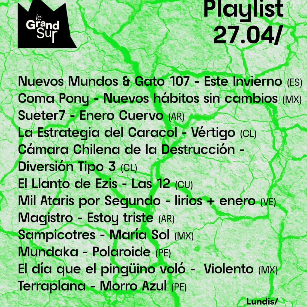 Le Grand Sur explore l'état actuel du rock indépendant sud-américain. Dans cet épisode, nous entendrons: Nuevos Mundos, Coma Pony, Sueter7, La Estrategia del Caracol, Cámara Chilena de la Destrucción, El Llanto de Ezis, Mil Ataris por Segundo, Magistro, Sampicotres, Mundaka, El día que el pingüinoi voló, Terraplana.